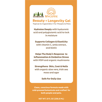 MycoVie Beauty + Longevity Gel is a revolutionary, dual-purpose gel designed to support beauty, skin, and graceful aging. Whether massaged into skin or scalp, or stirred into your morning smoothie or pet food, this plant-powered gel delivers a concentrated dose of nature’s most powerful and helpful ingredients, making it a truly universal approach to address aging and cellular renewal.